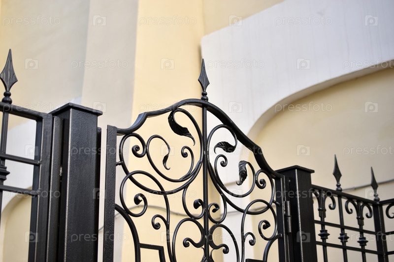 Классический желтый дом и красивый железный забор с воротами