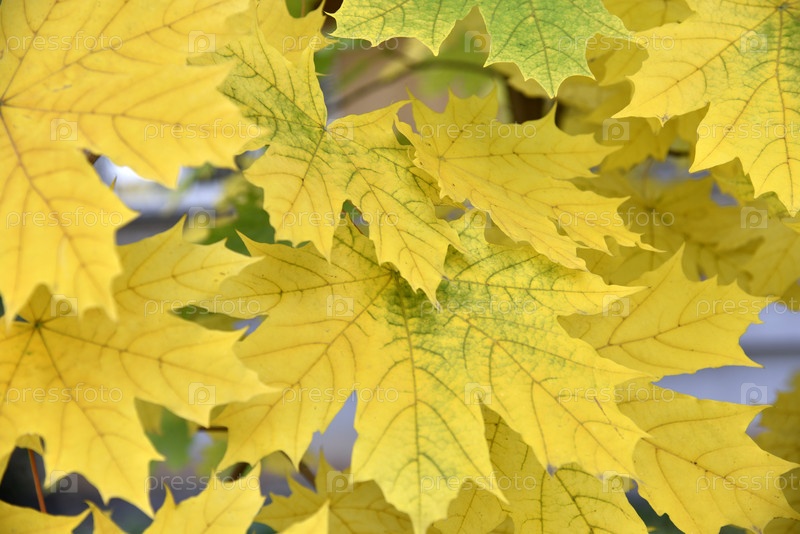 Красивый желто-зеленый кленовый лист крупным планом на ветвях