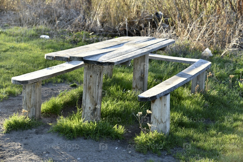 Скамейки и стол в кемпинге весенним вечером