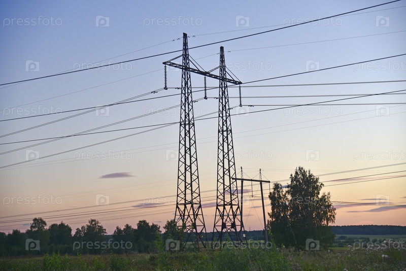 Красивая высоковольтная железная линия электропередачи вечером в закатном небе. Вечерний пейзаж с проводами и линиями электропередач