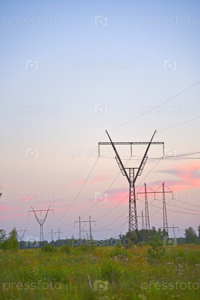 Красивая высоковольтная железная линия электропередачи вечером в закатном небе. Вечерний пейзаж с проводами и линиями электропередач
