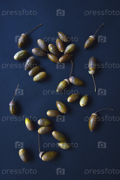Крупный план желудей орехов дуба Брауна на темно-синем фоне. Семена дуба