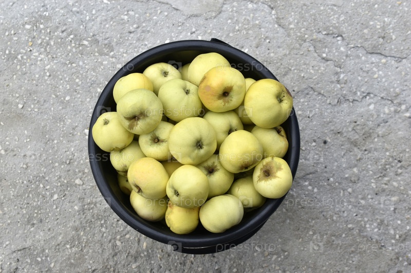 Зеленые спелые яблоки в черном ведре. Сбор яблок осенью