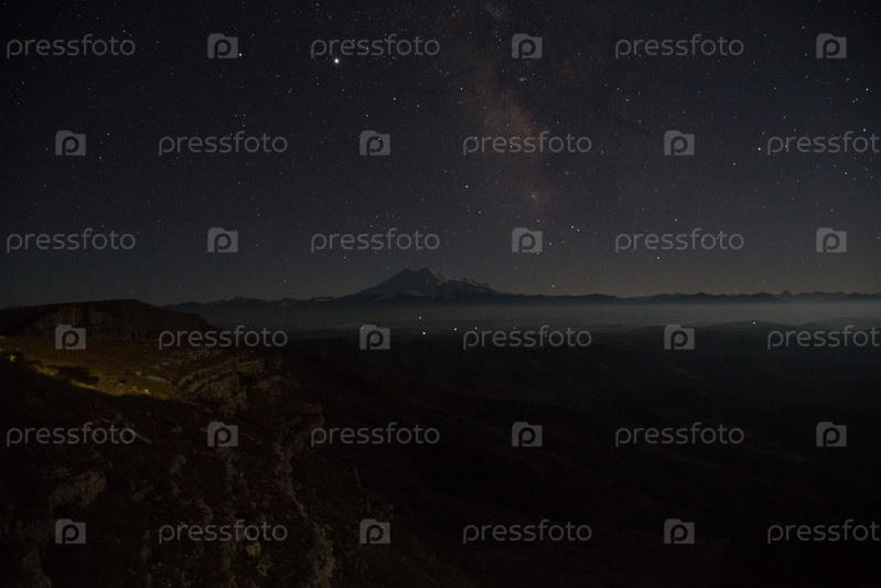 Эльбрус и Млечный Путь в ясном ночном небе. Вид с плато Бермамыт, Карачаево-Черкесская Республика, Россия