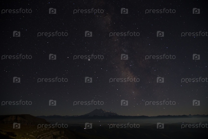 Эльбрус и Млечный Путь в ясном ночном небе. Вид с плато Бермамыт, Карачаево-Черкесская Республика, Россия