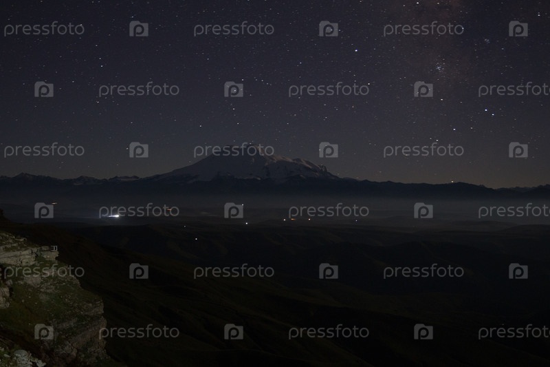 Эльбрус и Млечный Путь в ясном ночном небе. Вид с плато Бермамыт, Карачаево-Черкесская Республика, Россия