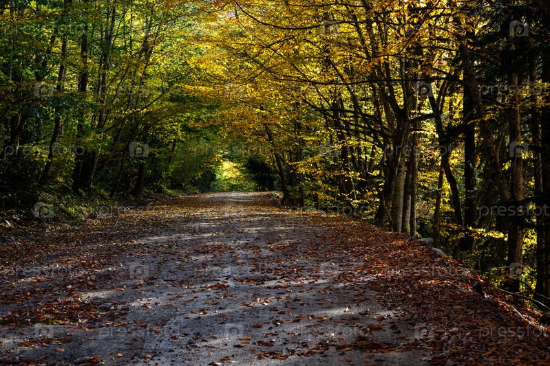 Грунтовая дорога, усыпанная осенними листьями. Кроны деревьев, покрытые пестрой листвой, образуют свод над дорогой