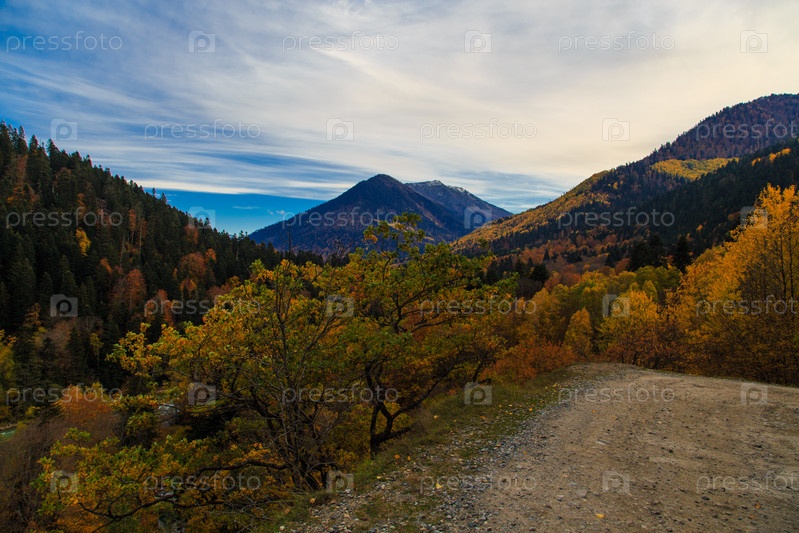 Горная дорога на крутом повороте с видом на осенний разноцветный лес, горные вершины и перистые облака на фоне голубого неба. Россия, Кавказ, Карачаево-Черкесия. Загеданское ущелье