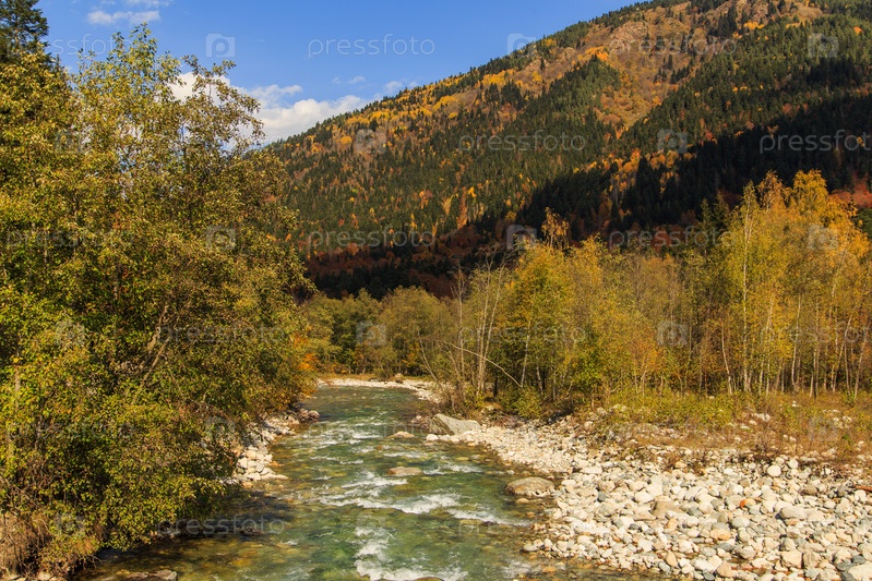 Вид сверху на горную реку и горные вершины, покрытые красочным осенним лесом. Горные вершины и перистые облака на фоне голубого неба. Россия, Кавказ, Карачаево-Черкесия. Загеданское ущелье