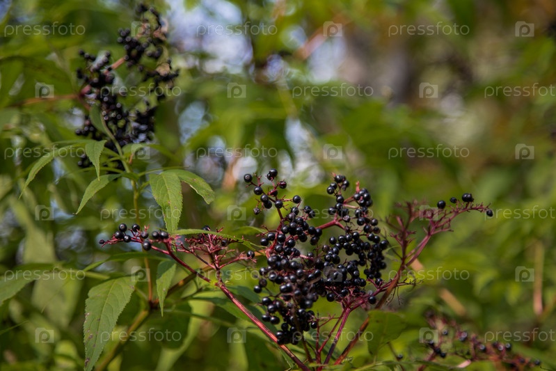 Черная бузина. Крупный план спелых ягод бузины на ветвях на фоне зеленых листьев. Осенняя лесная ягода. Размытый фон