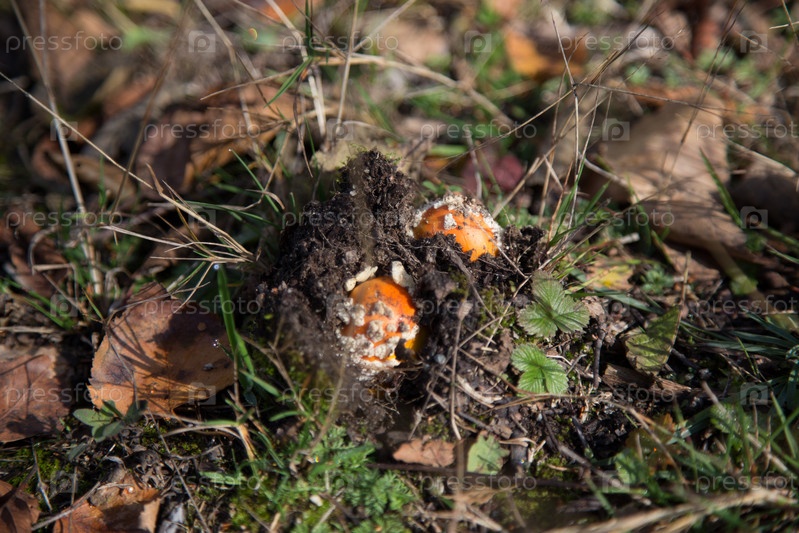 Мухомор красный, широко известный как мухомор или мухомор, поднимается из-под земли. Молодые недавно выращенные грибы