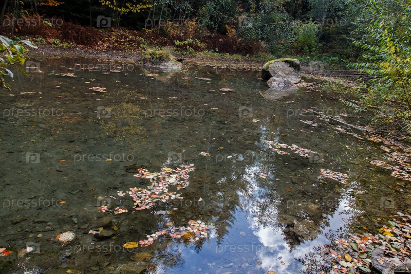 Лесное озеро с прозрачной водой в котором отражается небо и деревья усыпанное опавшими листьями