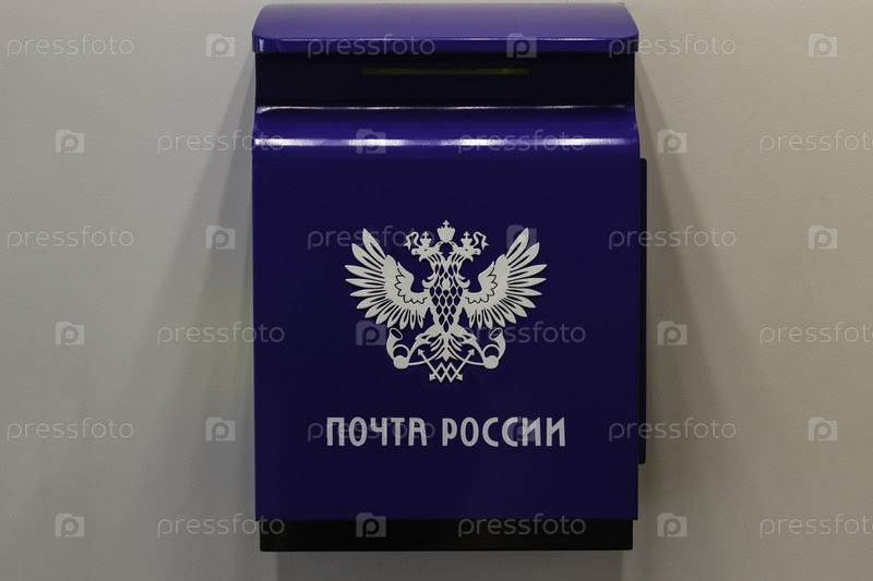 Русский почтовый ящик с гербом России и надписью на русском языке на почтовом ящике: Почта России. Синий почтовый ящик на стене