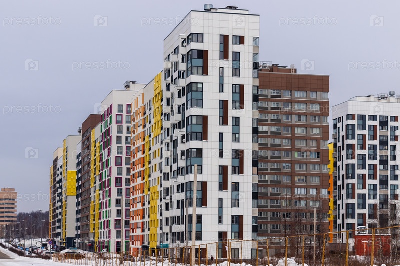 Современный многоквартирный дом с красочными фасадами на окраине города. Москва, Россия