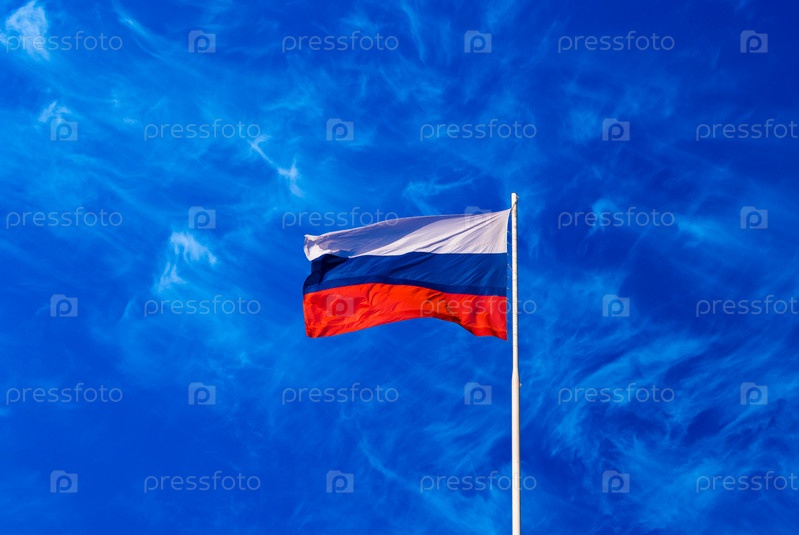 Флаг Российской Федерации на фоне ясного голубого неба. государственный символ