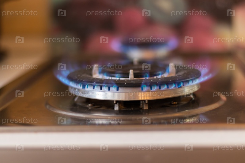 Газовая плита с синим пламенем. Печь с зажженной горелкой