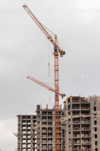 Строительство третьей очереди нового жилого комплекса «В лесу». Работа строительных кранов, идет возведение стен зданий. Москва, Россия
