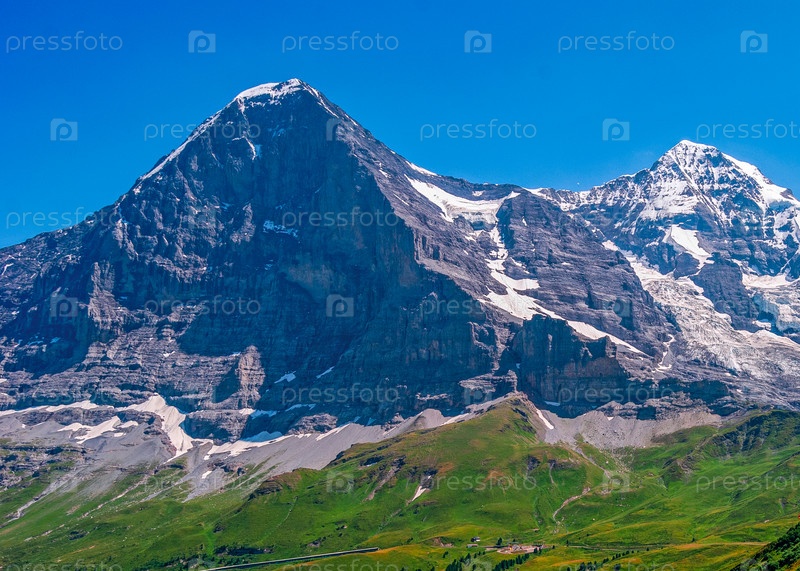 Северная стена пика Эйгера летом с ясным голубым небом и зелеными лугами. Гриндельвальд, Швейцария