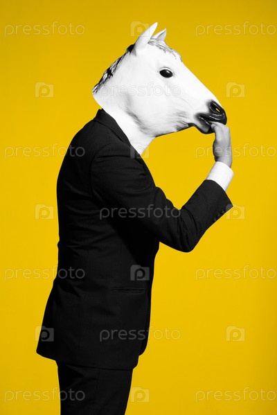 Мужчина в маске лошади на желтом фоне