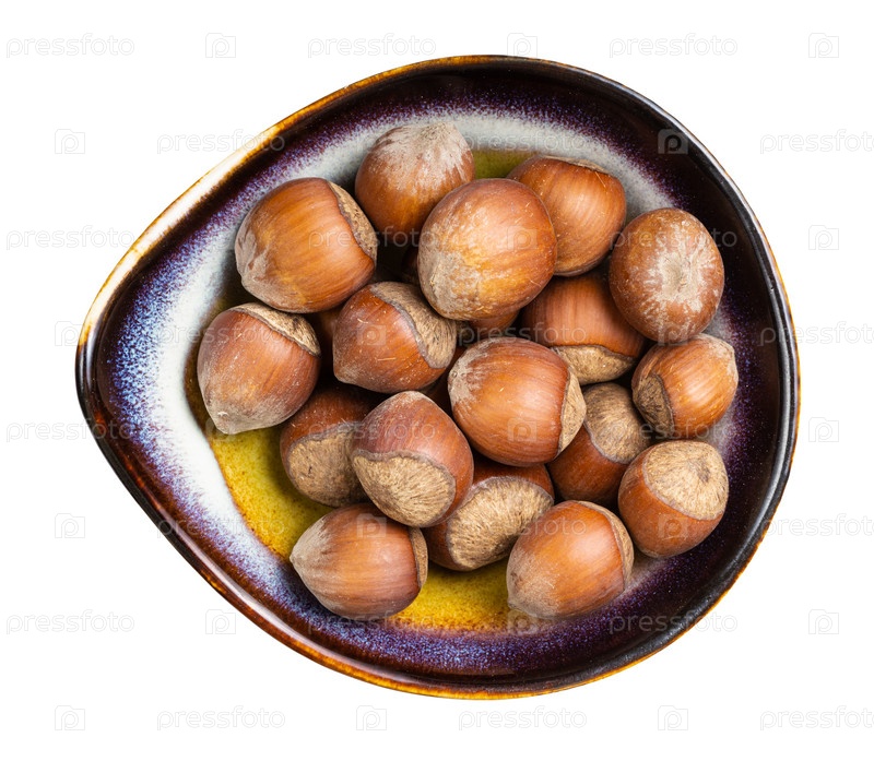 Вид сверху на целые орехи в миске изолированы