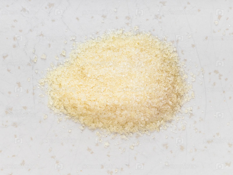 Куча кристаллического говяжьего желатина крупным планом на сером