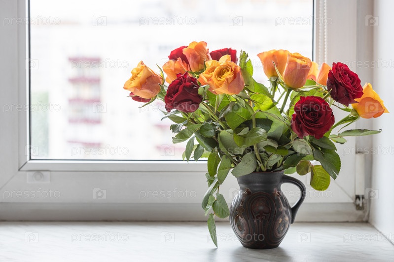 Красные и желтые розы в кувшине на подоконнике