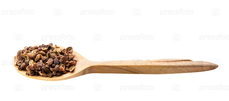 Розовый сычуаньский перец в деревянной ложке изолирован