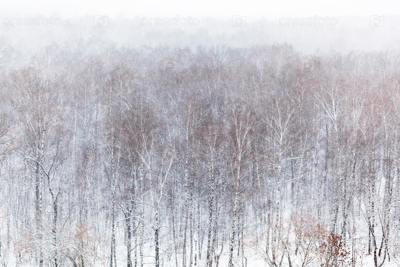 Вид с воздуха на березовую рощу в лесу во время снегопада