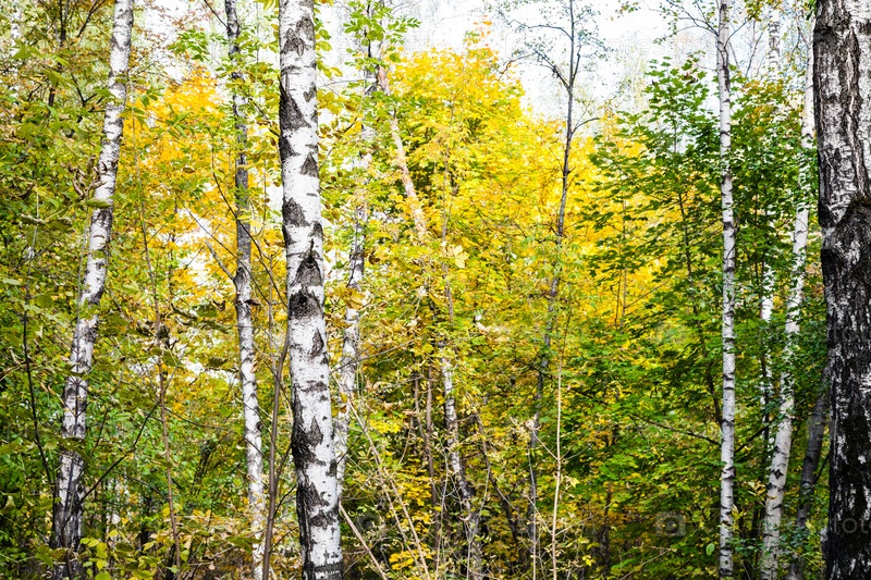 Березовая роща в осеннем лесу в солнечный октябрьский день