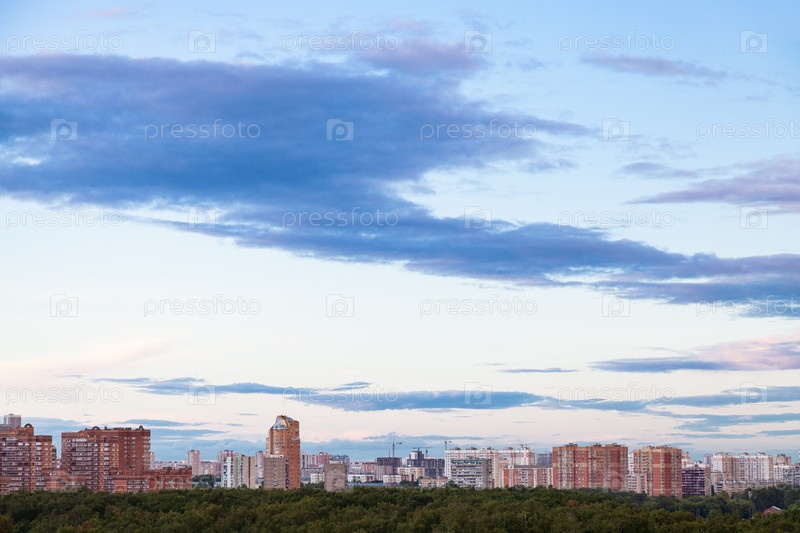Голубое небо с темными облаками над городом в летних сумерках
