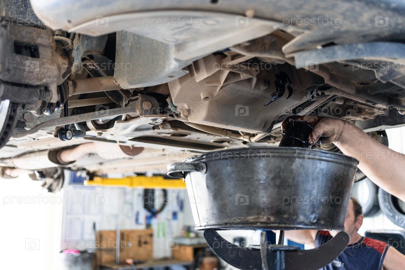 Слив старого моторного масла из автомобиля в автомастерской