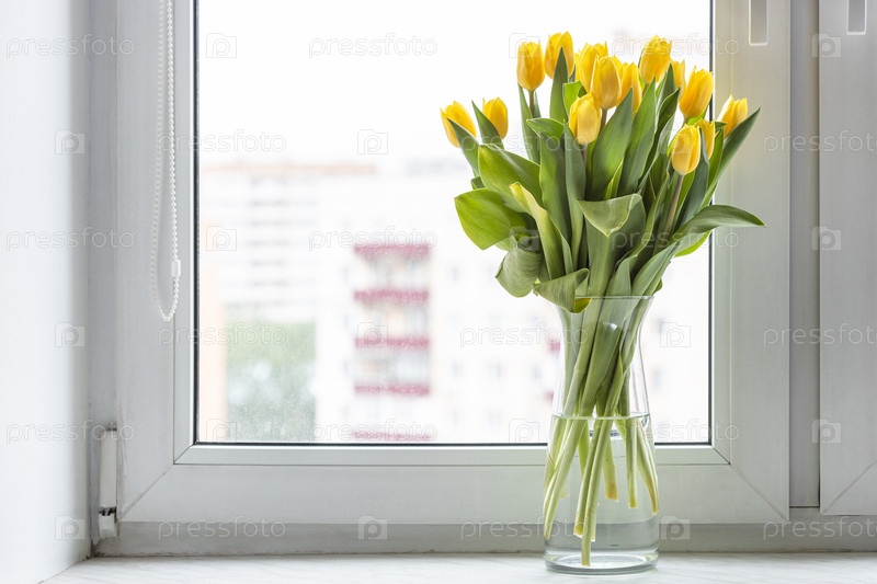 Букет тюльпанов в стеклянной вазе на подоконнике