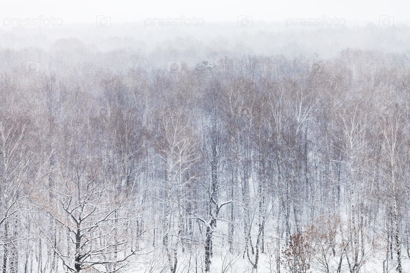 Вид с воздуха на лес в снегопад в зимний день