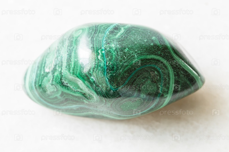 Полированный малахитовый камень на белом мраморе