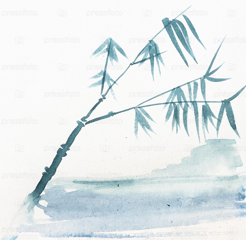 Эскиз трости на берегу моря в технике суми-э