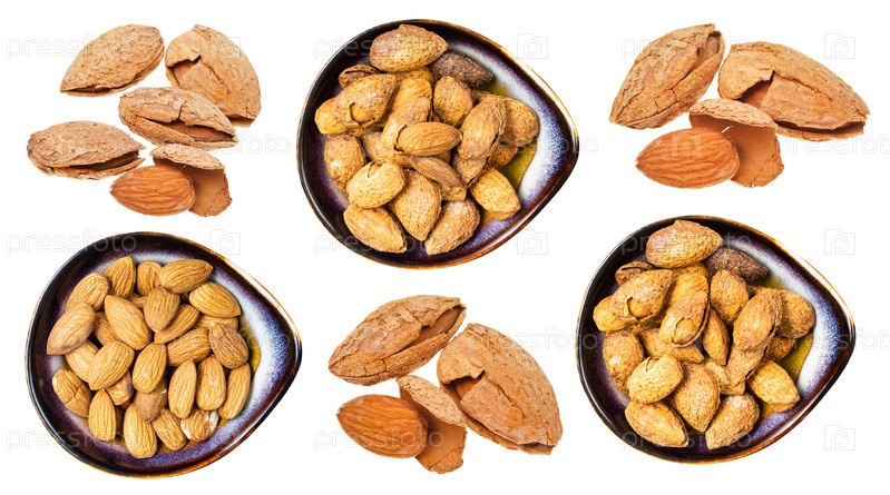 Набор различных семян миндаля, изолированных на белом