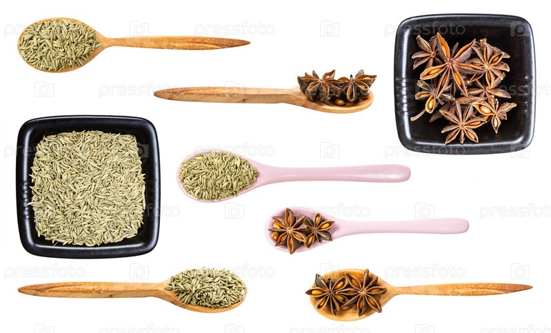 Набор различных анисовых специй, выделенных на белом