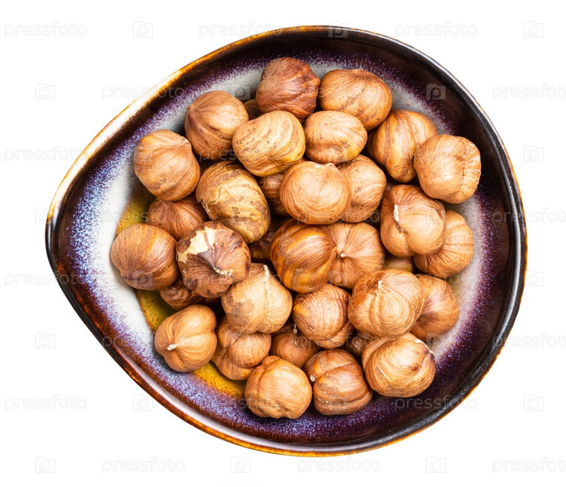 Очищенные фундуки в керамической миске изолированы