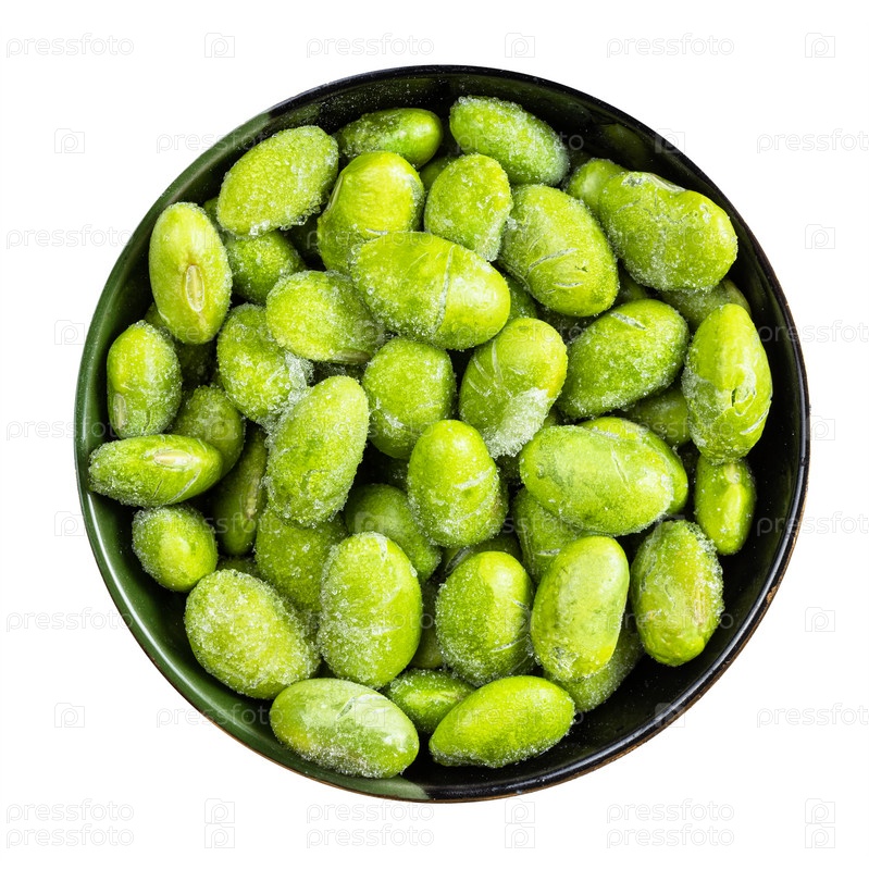 Вид сверху на замороженные незрелые соевые бобы в круглой миске