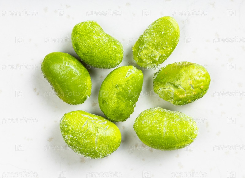 Несколько замороженных незрелых соевых бобов крупным планом на сером