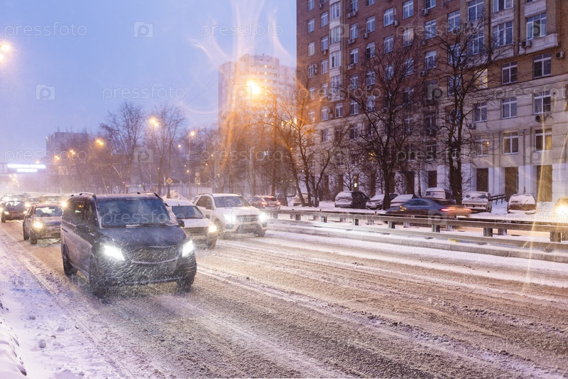 Автомобили едут по скользкой заснеженной городской дороге в снегопад