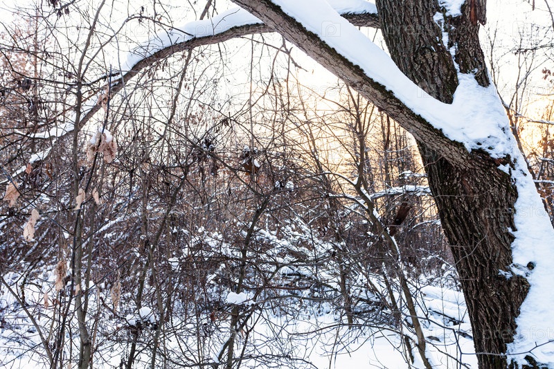 Густой подлесок в заснеженном городском парке
