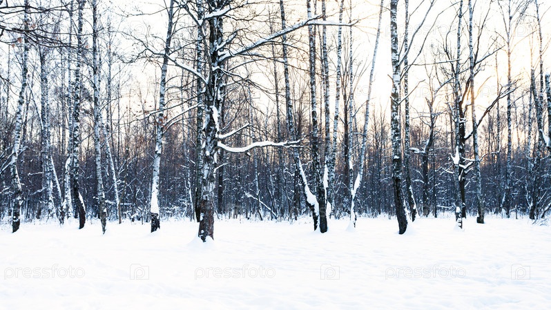 Панорамный вид на березовую рощу в заснеженном парке