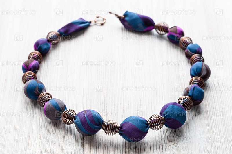 Ожерелье из круглых бусин, обернутых в голубую шелковую ткань