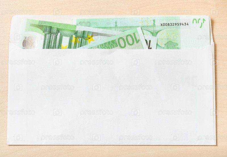 Много банкнот по сто евро в конверте на столе