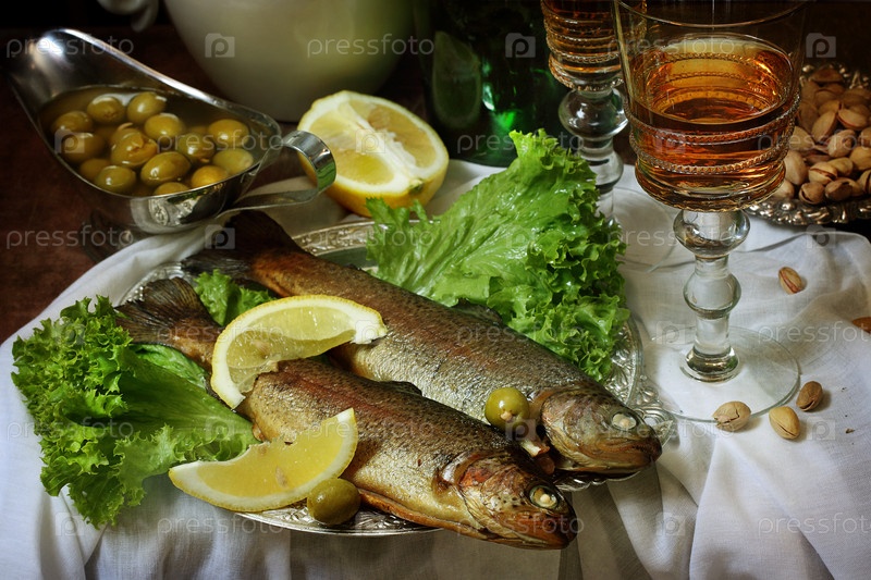 Натюрморт с вкусной копченой форелью, лимонами и салатом