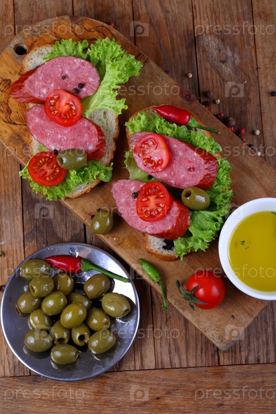 Чесночные колбаски с оливками на хлебе