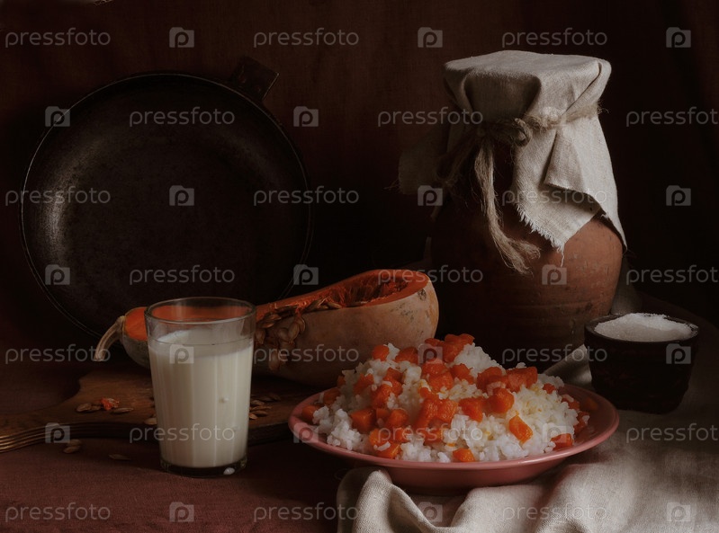 Пшенная каша с тыквой в деревянной миске и кувшине и стакане молока