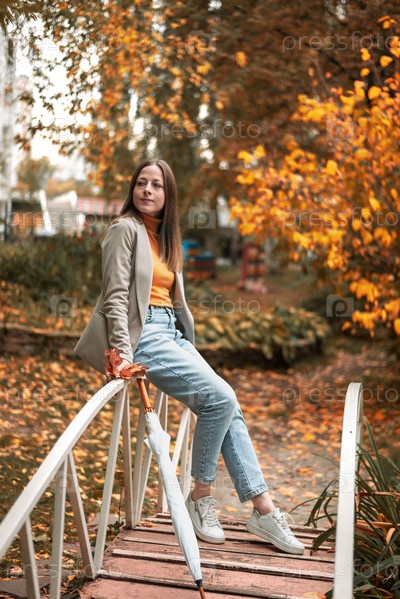 Молодая красивая девушка в джинсах и повседневной куртке в осеннем парке стоит на мосту, золотая осень
