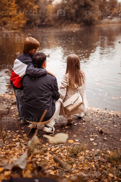 Счастливая семья с ребенком на осенней прогулке в городском парке с озером, кормит уток, вид сзади